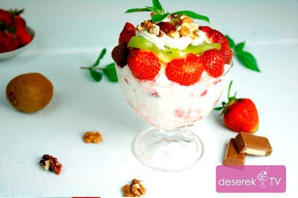 Idealnie nadaje się na wieczorne przyj ecie jak i popołudniowy podwieczorek. Wspaniały puchar bitej śmietany z jogurtem, bezami, truskawkami, kiwi i orzechami. Zamiast orzechów można dodać płatki migdałowe, które należy uprażyć na patelni na złoty kolor.