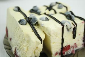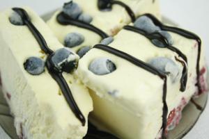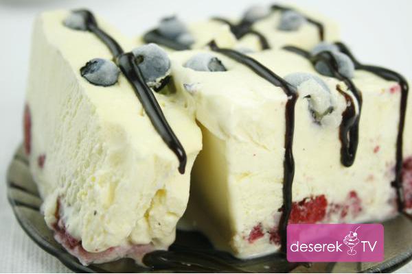 Przepyszny deser przypominający lody waniliowe z kawałkami owoców. Przed serwowaniem wyjąć z zamrażarki i pozostawić w lodówce na 30-40 min. aby deser delikatnie zmiękł. Podawać z sosem czekoladowym lub owocowym oraz dodatkiem wafli. Jest to kolejny smaczny i sprawdzony smakołyk z kategorii desery na zimno.
