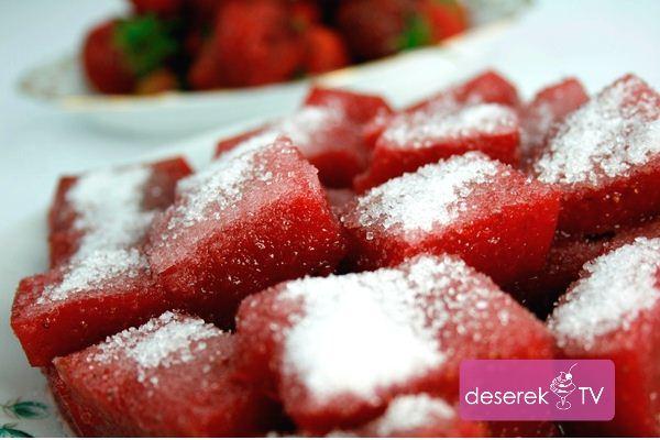 Idealny smakołyk dla naszych maluchów i pozostałych łakomczuchów :). Jest to przepis, w którym zastosowałem truskawki ze względu na trwający sezon truskawkowy, ale takie galaretki możecie przygotować z dowolnych owoców. Galaretki można podawać w formie kostek lub szerokich plastrów. Najlepiej podawać same galaretki na talerzyku a cukier wysypać obok, a następnie maczać je w cukrze i zjadać 🙂 . Można je także posypać wiórkami kokosowymi lub zmielonymi migdałami.