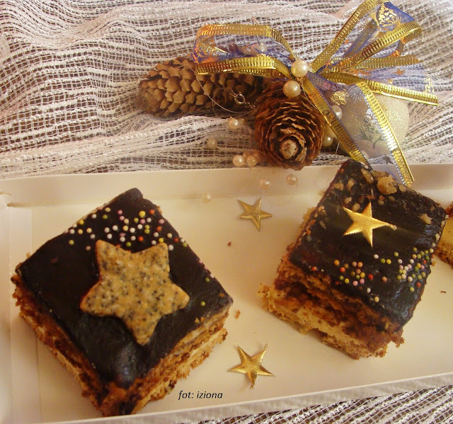 Piekłam 70 minut w piekarniku nagrzanym do 180 st. C, grzanie góra dół. Po ostudzeniu posmarowałam polewą czekoladową i ozdobiłam.